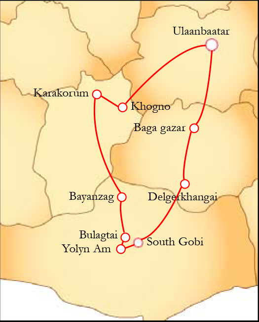 The South Gobi is the largest province in Mongolia. It is an area of ancient and unique natural wonders. The incredible open land will radically change as you speed by and the contrasts in the diverse sceneries may draw your attention so much you ride off the road! Overnight in ger camp. (B, L, D)